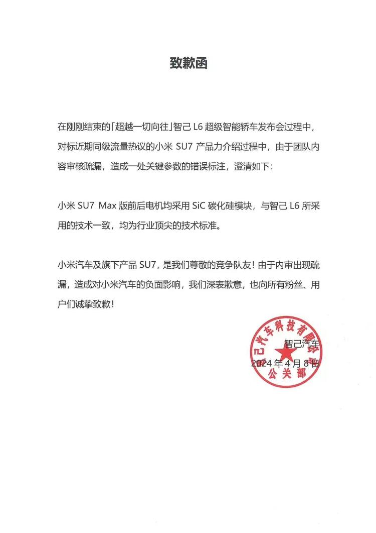 4月9日凌晨,智己汽车发布致歉函。智己汽车称,在刚刚结束的“超越一切向往”智己L6超级智能轿车发布会过程中,对标近期同级流量热议的小米SU7产品力介绍过程中,由于团队内容审核疏漏,造成一处关键参数的错误标注,澄清如下: