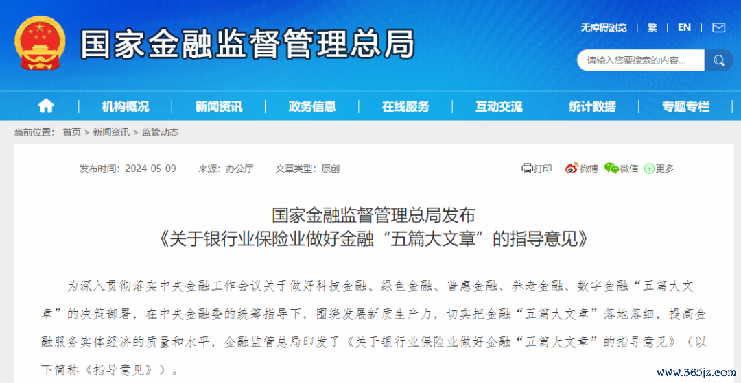 5月9日,金融监管总局发布《关于银行业保险业做好金融“五篇大文章”的指导意见》(下称《意见》),从优化金融产品和服务、发挥银行保险机构职能优势、完善银行保险机构组织管理体系等方面系统部署做好金融“五篇大文章”。