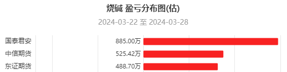 盈亏剖析:数据显示,一周内国泰君安、中信期货、东证期货在烧碱上盈利居前,三机构分别盈利885.00万元,525.42万元,488.70万元。