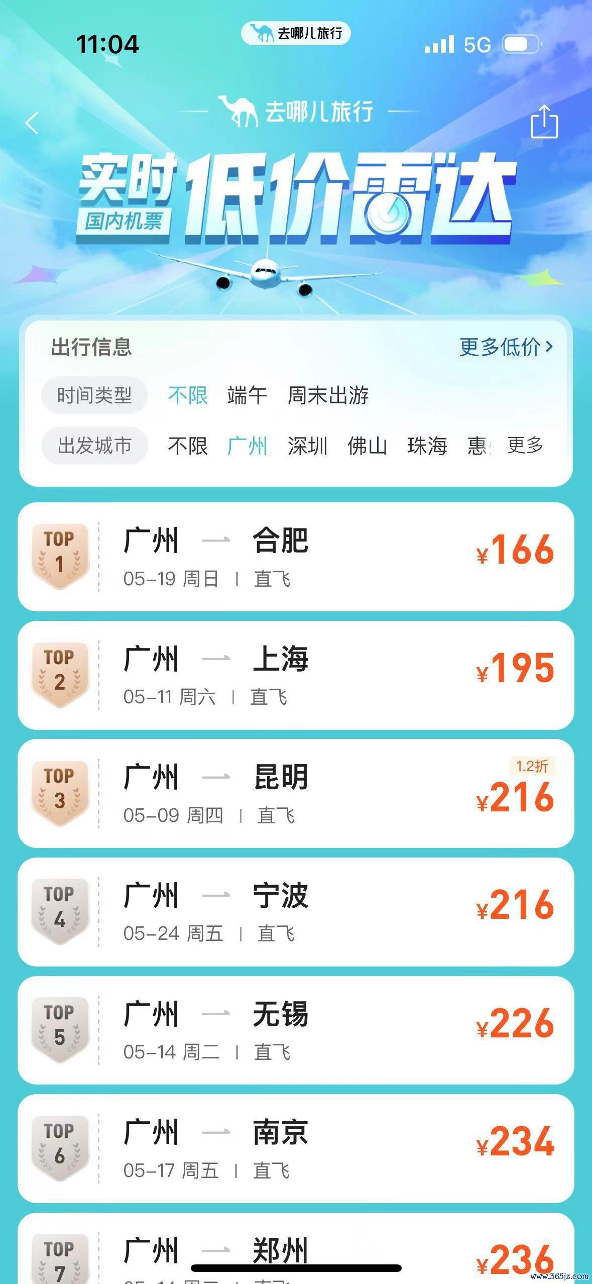 去哪儿数据显示,国内热门航线中,广州、深圳等地多个航班价格低于高铁,从广州直飞合肥、上海、昆明、宁波和无锡,裸票价格在200元左右。此外,“五一”假期后第一周,国内机票特别是从北上广一线城市到海南、云南等热门目的地的机票降幅明显。记者从途牛旅游网了解到,广州出发机票降幅较大的有广州-昆明,较五一假期票价降幅最大超过70%,广州-重庆降幅在65%左右,广州至武汉降幅近60%,广州-杭州降幅在37%左右,广州-成都32.6%。记者查询发现,广州-丽江往返机票在1000元出头。出境机票方面,广州-清迈往返机票也已经接近2000元。