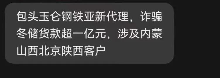 近日,包头钢贸市场爆出包头市玉仑钢铁贸易有限责任公司以收取冬储资源订货为由,收受多家贸易商预付款,但未交款至钢厂订货,现无法正常交货。据传,涉案资金达一个多亿,其中个别客户涉及近千万,后续是否还有更多牵涉资金还在调查中。