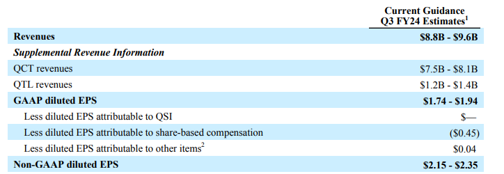 高通预计,该公司第三财季的营收将在88亿美元至96亿美元之间,区间中点高于华尔街预期的90.8亿美元;调整后每股收益将在2.15美元至2.35美元之间,也高于市场预测的2.16美元。