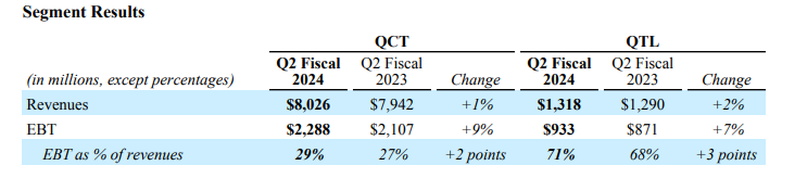 最后,QTL营收同比增长2%至13.2亿美元,高于预期的13.1亿美元,扭转了去年四季度同比下滑4%至14.60亿美元的颓势。这部分业务的税前利润率高达71%,主要是向高通的5G或蜂窝技术集成的技术授权费用